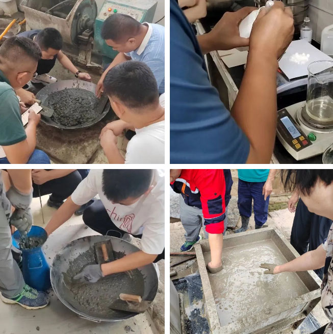 質(zhì)地優(yōu)良的粗骨料玄武巖、高性能的微珠粉、硅灰粉摻合料、直徑0.2毫米鋼纖維……原材料選擇較2021年研發(fā)的C80混凝土標(biāo)準(zhǔn)更高、品控更加精細(xì);一次次試配、優(yōu)化,探索最優(yōu)配合比;一次次攪拌,從180秒、240秒……直到600秒探尋最佳攪拌時(shí)長(zhǎng);一次次鋼板擦了再擦進(jìn)行坍落度、擴(kuò)展度測(cè)試,尋找坍落度和擴(kuò)展度的最好關(guān)聯(lián);一次次優(yōu)化施工性,直接用手測(cè)量浮漿厚度(感知混凝土的和易性)……記錄工作狀態(tài)的一張張照片、一禎禎視頻,文職小編不禁感慨:特固德人是混凝土做的骨肉!